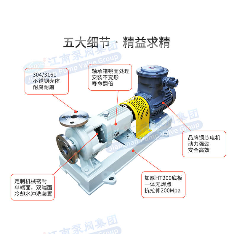 - JIH-HX不锈钢耐腐蚀离心泵高效节能、抗汽蚀性能强,适用温度范围广。具有运行稳定、噪音振动低、可靠性高、寿命长等优点,是碱液、醇类、各种有机溶剂等介质的理想输送设备。