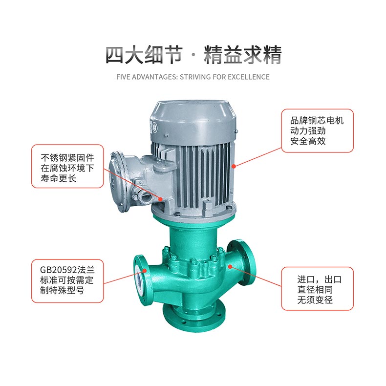 - GFMC氟塑料立式磁力管道泵是一种采用立式安装方式,具有耐腐蚀泵的优点无泄漏管道磁力泵,泵进出口径相同,结构紧凑、占地面积小、进行无泄漏运转;且位于同一中心线上,材质优良,泵体、叶轮、隔离套等过流部件均采用氟塑料合金制造,叶轮直接与电机轴连接,高效、节能、低噪音,能有效的平衡泵运转产生的径向和轴向负荷;