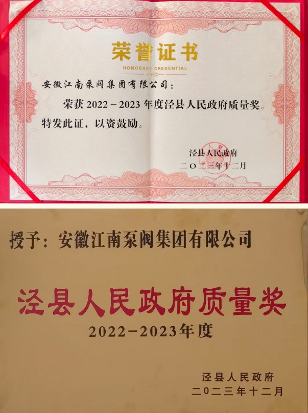 喜报!江南泵阀集团荣获“泾县人民政府质量奖”