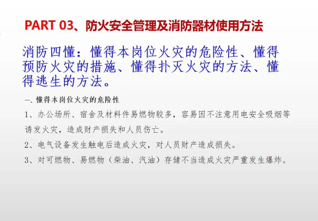 培训中,汪恒讲师以视频、图片及文字的形式生动地阐述了提升消防安全知识的重要性,同时从防火、灭火、自救等方面详细介绍了火灾的形成过程、自救逃生的方法以及灭火器材的种类和操作方法等一系列消防安全知识,参会人员深受教育。