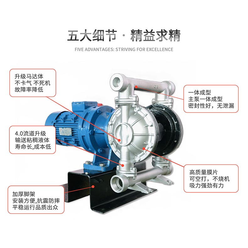- 2、电动隔膜泵品种多,泵体介质过流部分,可根据用户要求不同,分为铸钢、不锈钢、铝合金、氟塑料等,隔膜泵电机可分为普通电机、防爆电机、变频电机和电磁调速电机;